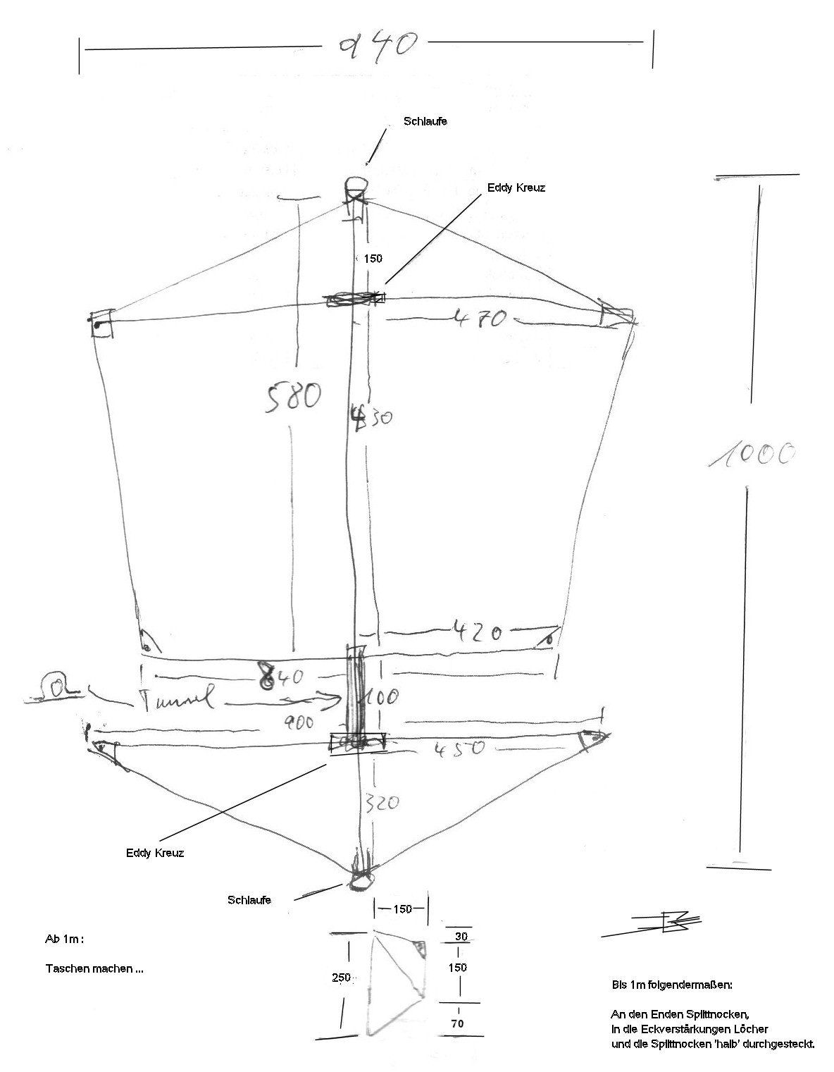 I have the "percent plan" which gives the dimensions of the kite depending on the keel length and a "ready" plan which shows a kite with 1 m keel length and the calculated lengths of all other dimensions.